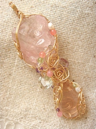 石などを用い、Kuthumiオリジナルのモチーフ(バラ・3枚の葉っぱ・5枚の花びらのお花・菖蒲・4枚羽根・ビーズ入り羽根ets...) を使いながら表裏両面使いが出来るようワイヤーを運ばせ、その後、クリスタルビーズを飾る事で、見た目の装飾美とクリスタルヒーリング効果を期待するアクセサリーに仕立て上げる Kuthumiオリジナルなワイヤーアクセサリー技法です。